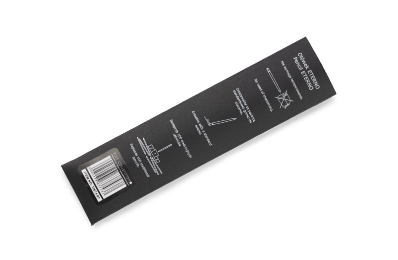 Z pojemnym wymiarem 150 x ⌀9 mm i wagą zaledwie 17 g, Ołówek ETERNO jest idealny do przenoszenia w każdej teczce czy plecaku. Zapakowany w eleganckie czarne etui papierowe, które dopełnia ekologiczny charakter produktu, świetnie nadaje się na upominek korporacyjny lub element zestawu piśmienniczego z logo Twojej firmy.